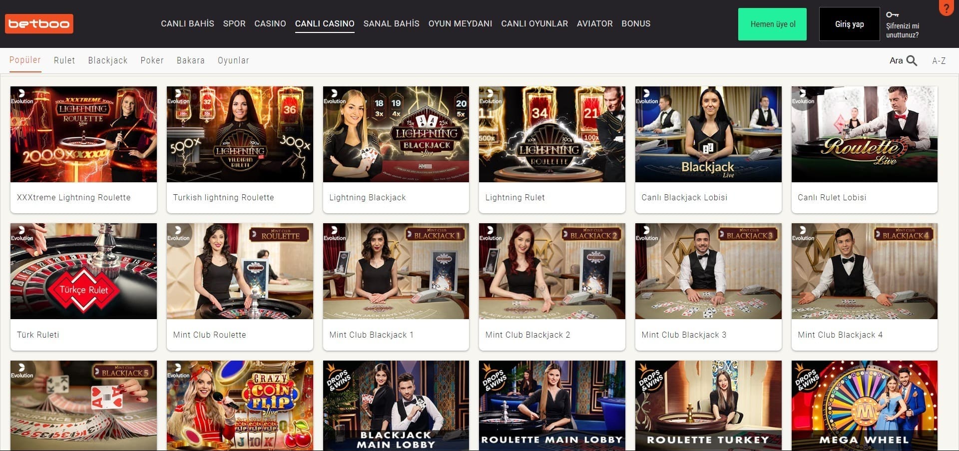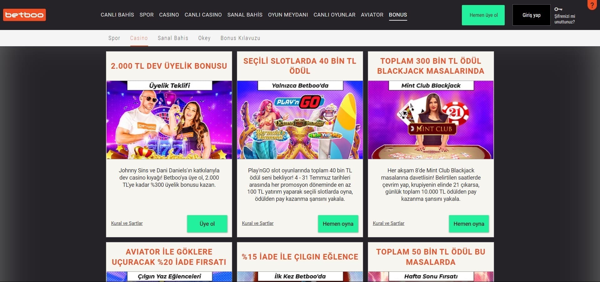 Betboo Casino bünyesinde video poker, rulet ve blackjack gibi 90’dan fazla farklı casino oyununun yanı sıra spor bahisleri, canlı bahisler gibi çeşitli bahis hizmetleri de verilmektedir. BetbooCasino sağladığı bonuslarla müşterilerinin ilgisini çekmekte, Casino Betboo günden güne büyümektedir.