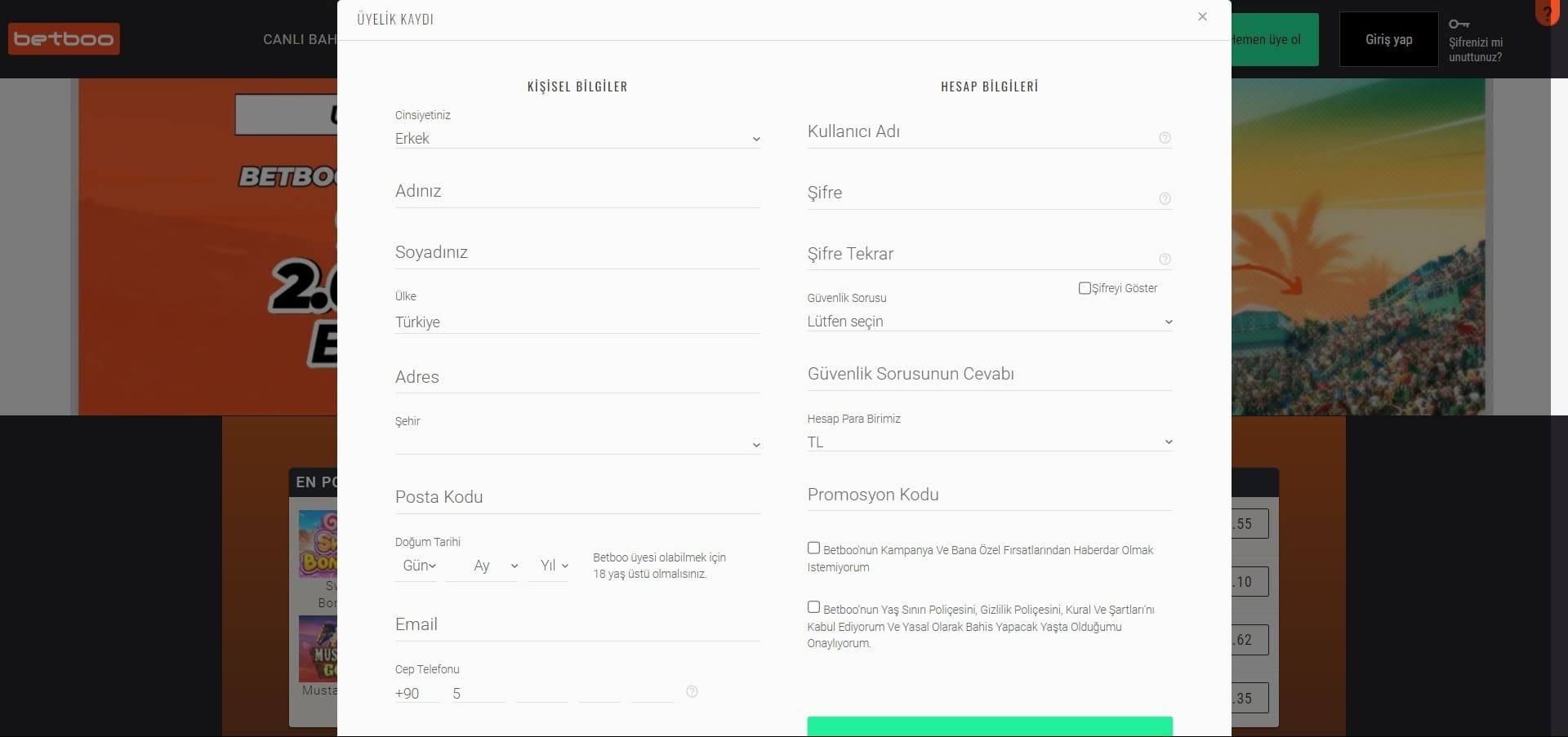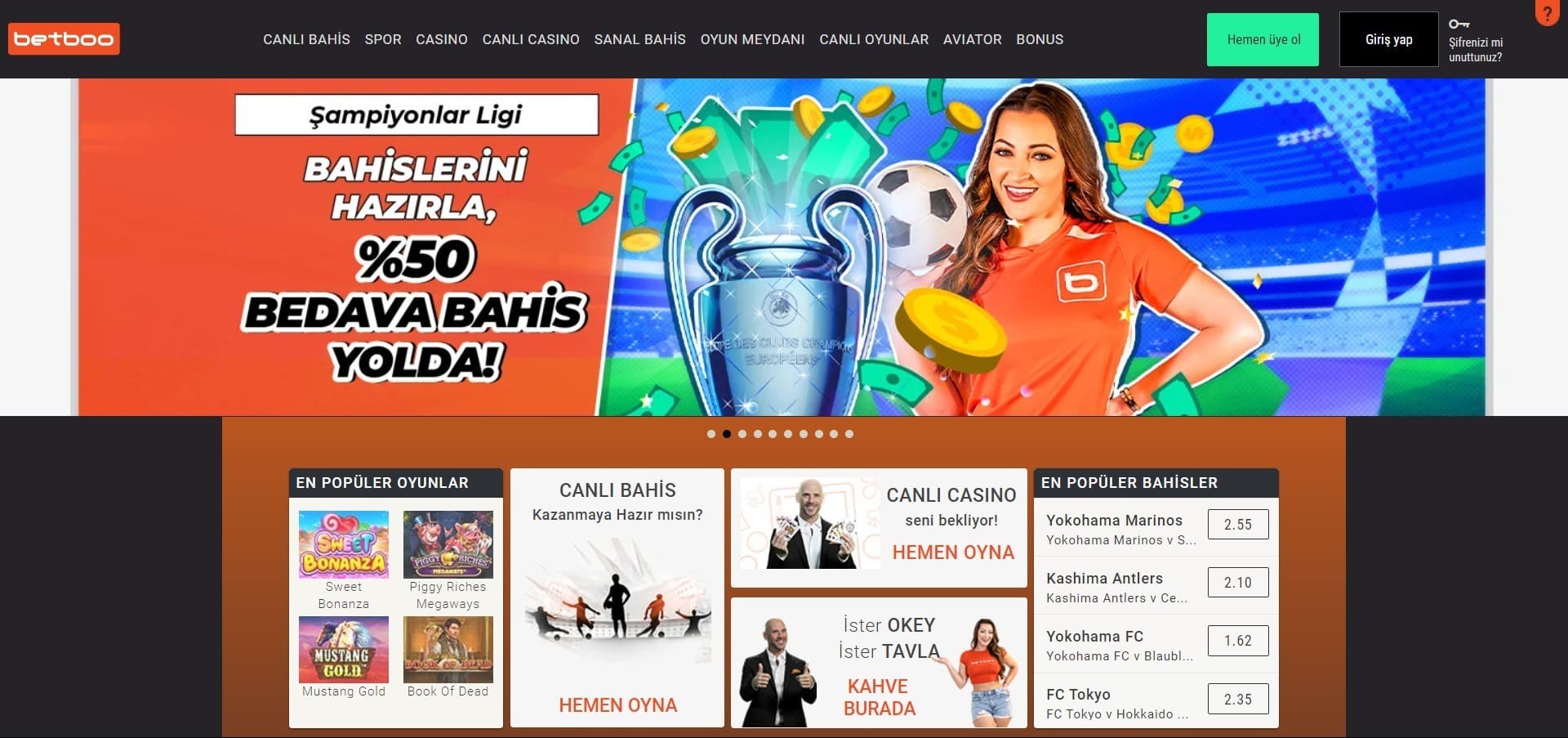 Betboo, 2011 yılından beri hizmet veren bir bahis ve casino sitesidir. Piyasada adını sıkça duyuran site, bugün en çok müşteriye sahip canlı casino ve bahis sitelerinden biri olmakla birlikte güvenilir ve müşteri memnuniyetini ön plana alan yaklaşımıyla her geçen gün büyümeye devam etmektedir.