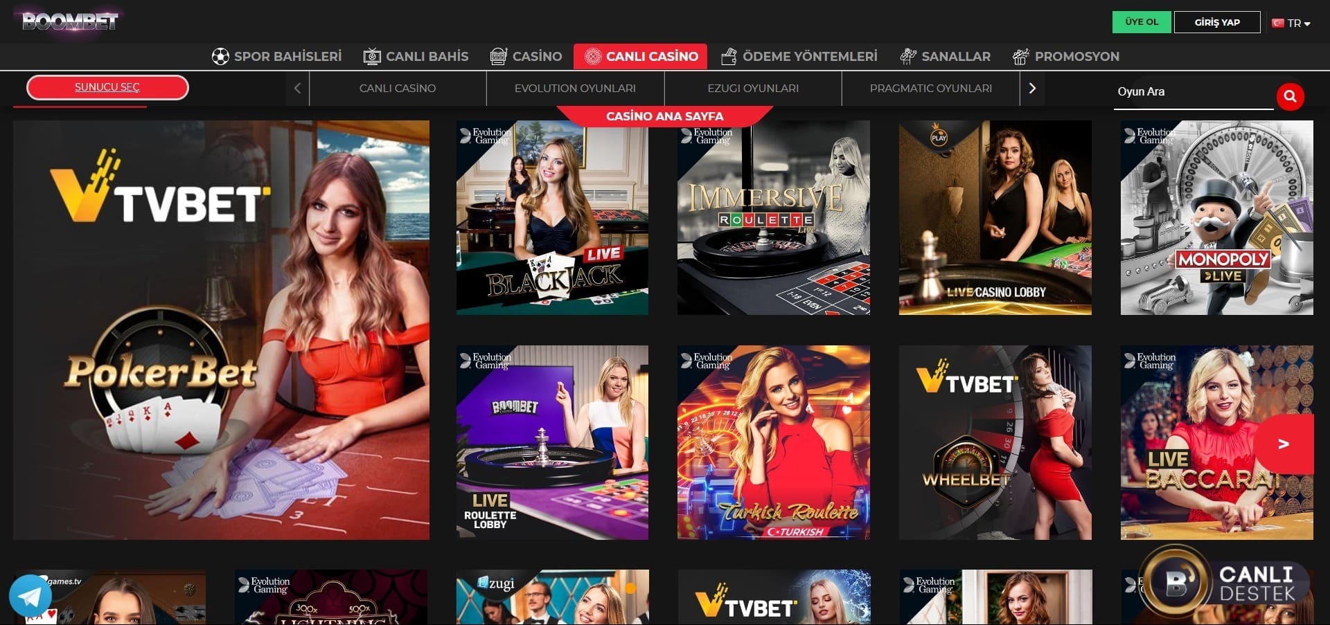 Boombet Online Casino bölümü yine klasik casino severlerin arayacağı her oyunu ve zengin çeşitliliği bulabileceği profesyonel bir online casino bölümüdür. Canlı video bağlantısıyla gerçek casino atmosferine bağlanarak oynanan canlı casino oyunları arasında rulet, poker, bakara, blackjack gibi klasik casino oyunları bulunmaktadır.