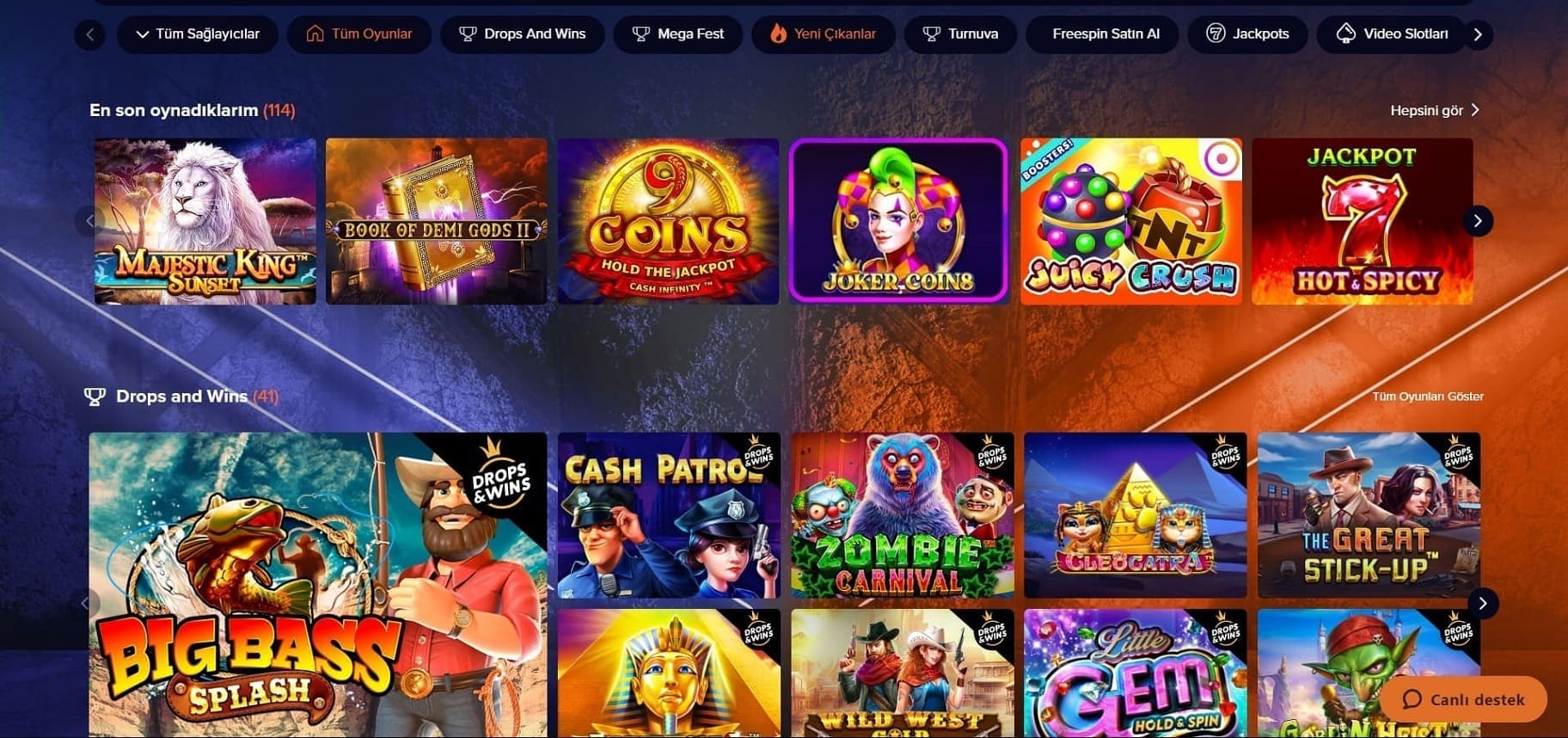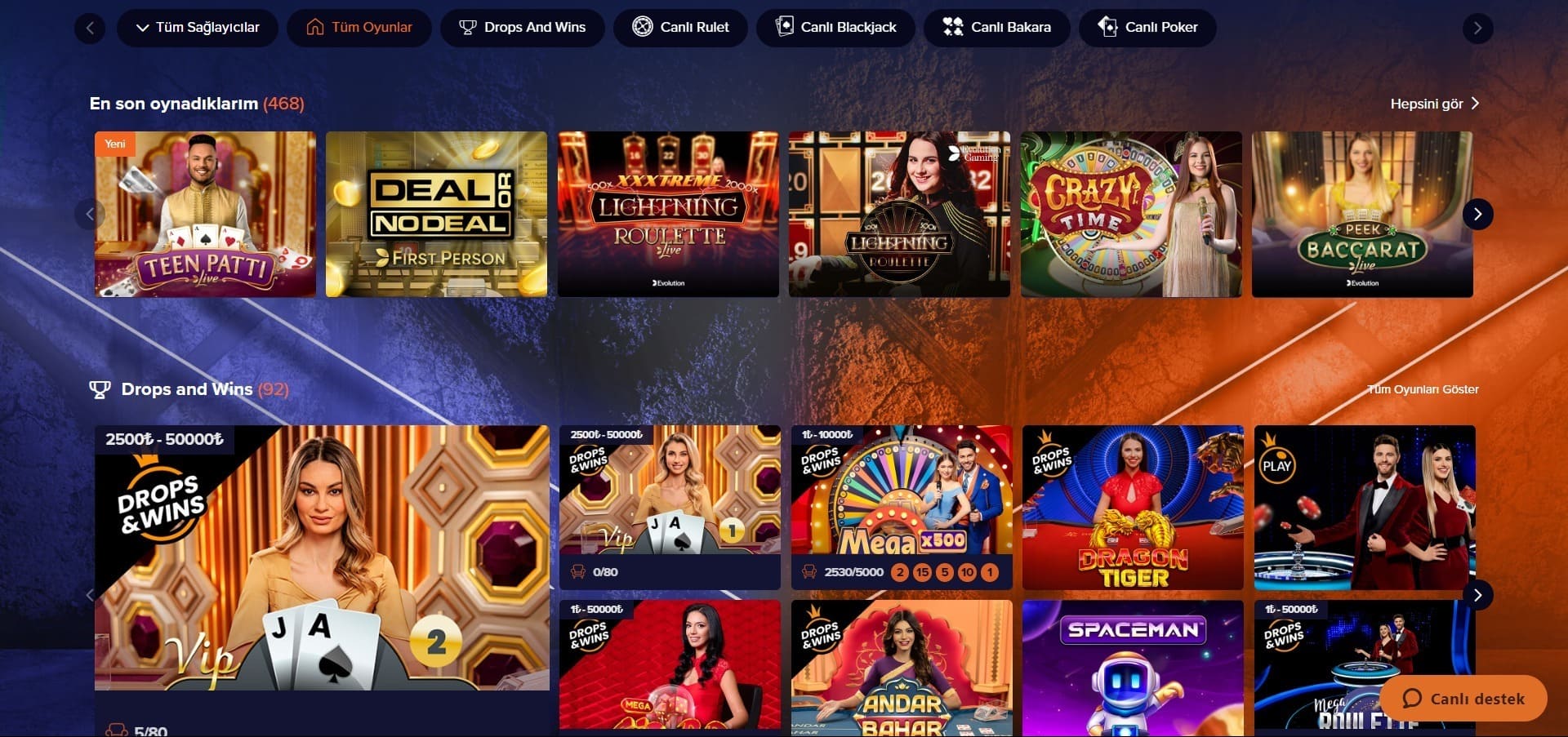 Sitemizde casino, canlı casino, bahis, canlı bahis ve sanal spor olmak üzere birçok seçeneğimiz bulunmaktadır.