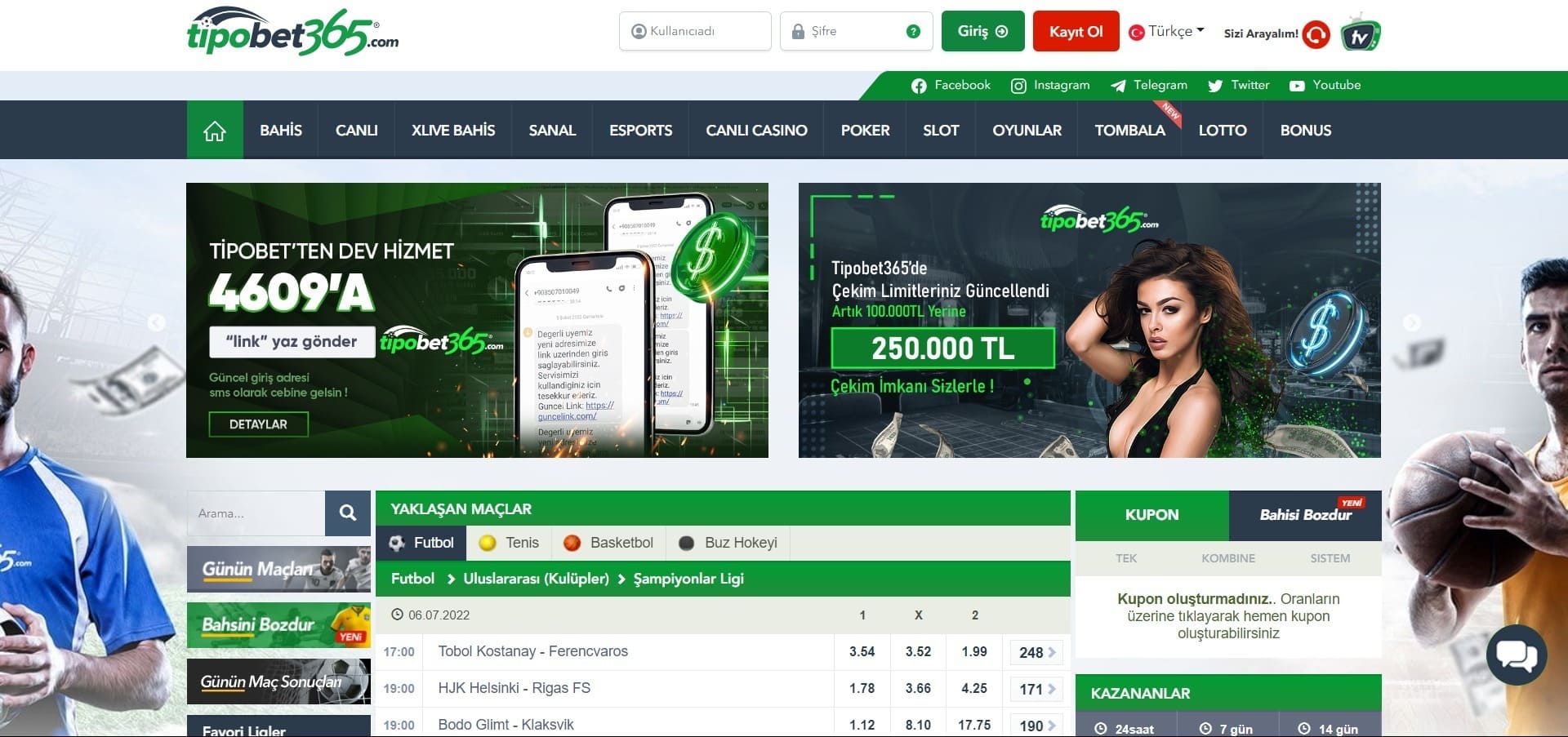 Tipobet Casino sunduğu yüzlerce farklı müsabakayla ve yüksek oranlarıyla birlikte maç öncesi ve canlı bahis gibi farklı bahis çeşitleriyle oldukça eğlenceli ve geniş bir bahis deneyimi sunan Avrupa’nın en önemli bahis platformlarından biridir. Ayrıca Tipobet TV ile bahis oynadığınız müsabakayı canlı yayın ile takip de edebilirsiniz.
