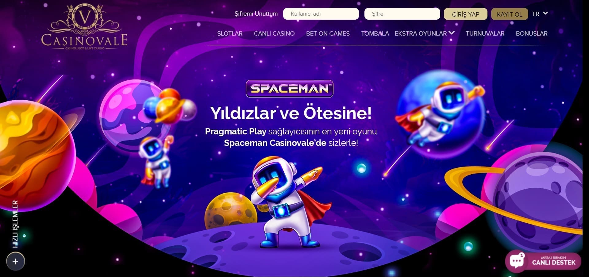 CasinoVale online kullanıcılarına en samimi, güvenilir ve adil hizmeti sunmayı amaç edinmiş bir casinodur. CasinoVale bünyesinde dünyaca popüler canlı casino oyunları, Slot oyunları, Tombala oyunları vb. oynamak mümkündür. Oyunların yanı sıra yüzlerce CasinoVale bonus avantajını kullanabilirsiniz.