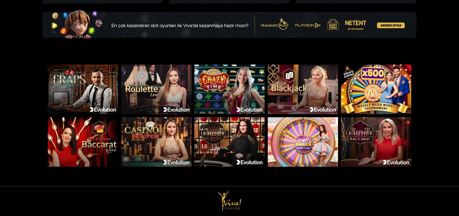 Viva Casino uzun süredir birçok ülkede hizmet veren dünyaca ünlü ve geniş bir bahis ve online casino sitesidir. Casino Viva online bünyesinde pokerden rulete, modern video oyunlardan klasik masa oyunlarına her türlü canlı veya sanal casino oyununu oynayabilir, e-sporlar dahil yüzlerce farklı spor dalında bahis oynayabilirsiniz.